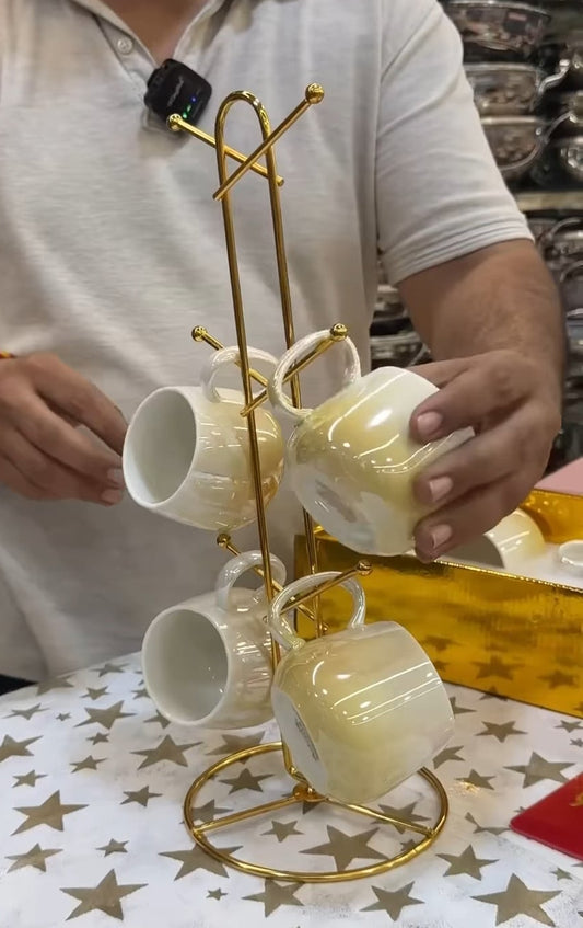 Addox ceramic cup set in gradient colour with golden PVD coated cup stand