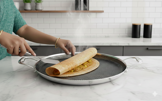 Stahl Artisan Schild | 30 cm Dosa Tawa Triply Stainless Steel + PEEK-Reinforced Non-Stick Dosa Tawa