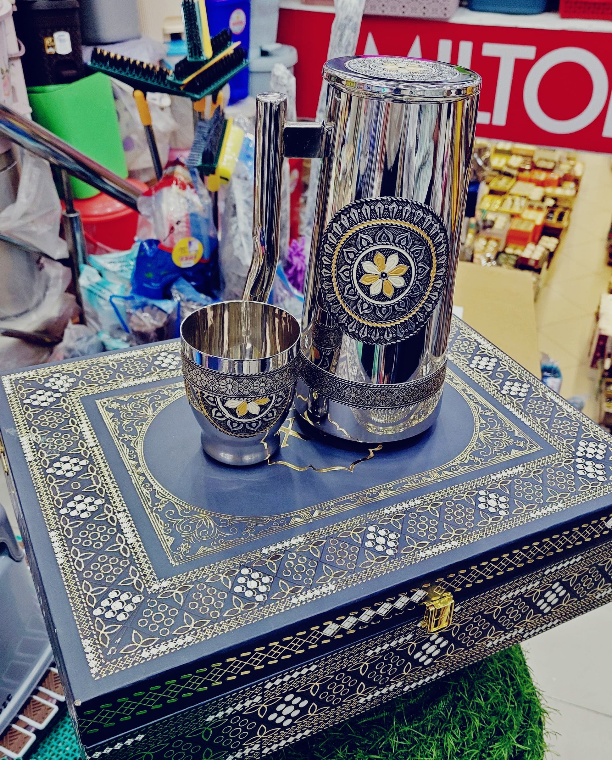 Crafted with stainless steel, this antique lemon set includes 6 elegant glasses and a jug, all conveniently packed in a beautiful wooden box. Perfect for entertaining guests or adding a touch of vintage charm to your home.