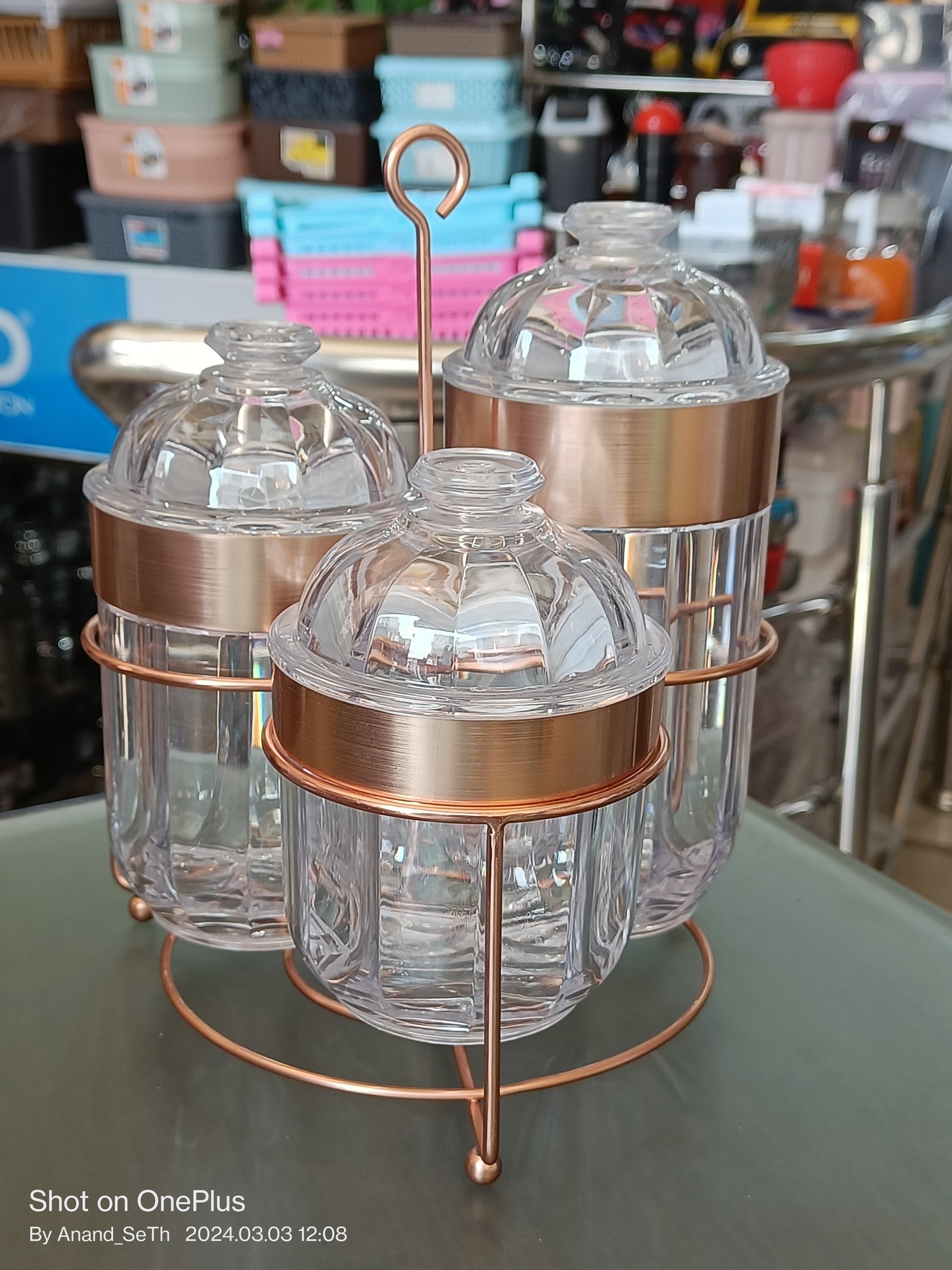 A Dry fruit tray with Unbreakable acrylic Jars and Rust proof SS stand.