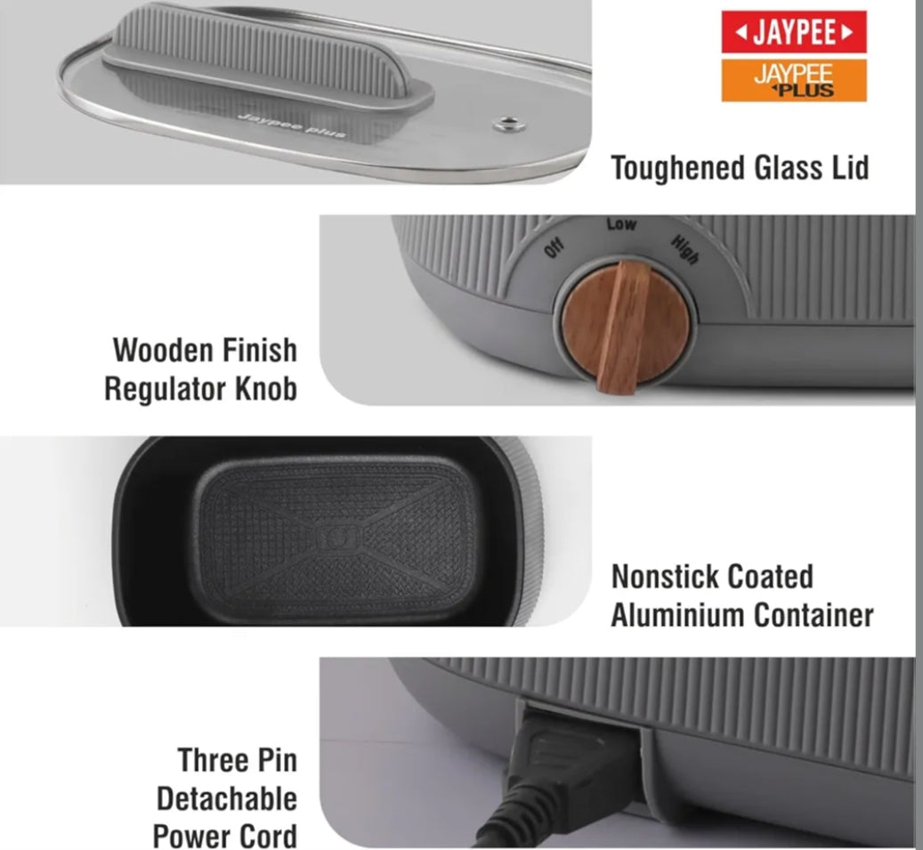 The Jaypee Multicook 4-in-1 Electric Cooker is a versatile kitchen appliance that allows you to steam, cook, and boil with ease. Featuring a non-stick coated aluminium container and a toughened glass lid, it ensures efficient cooking and easy cleanup for your convenience.
