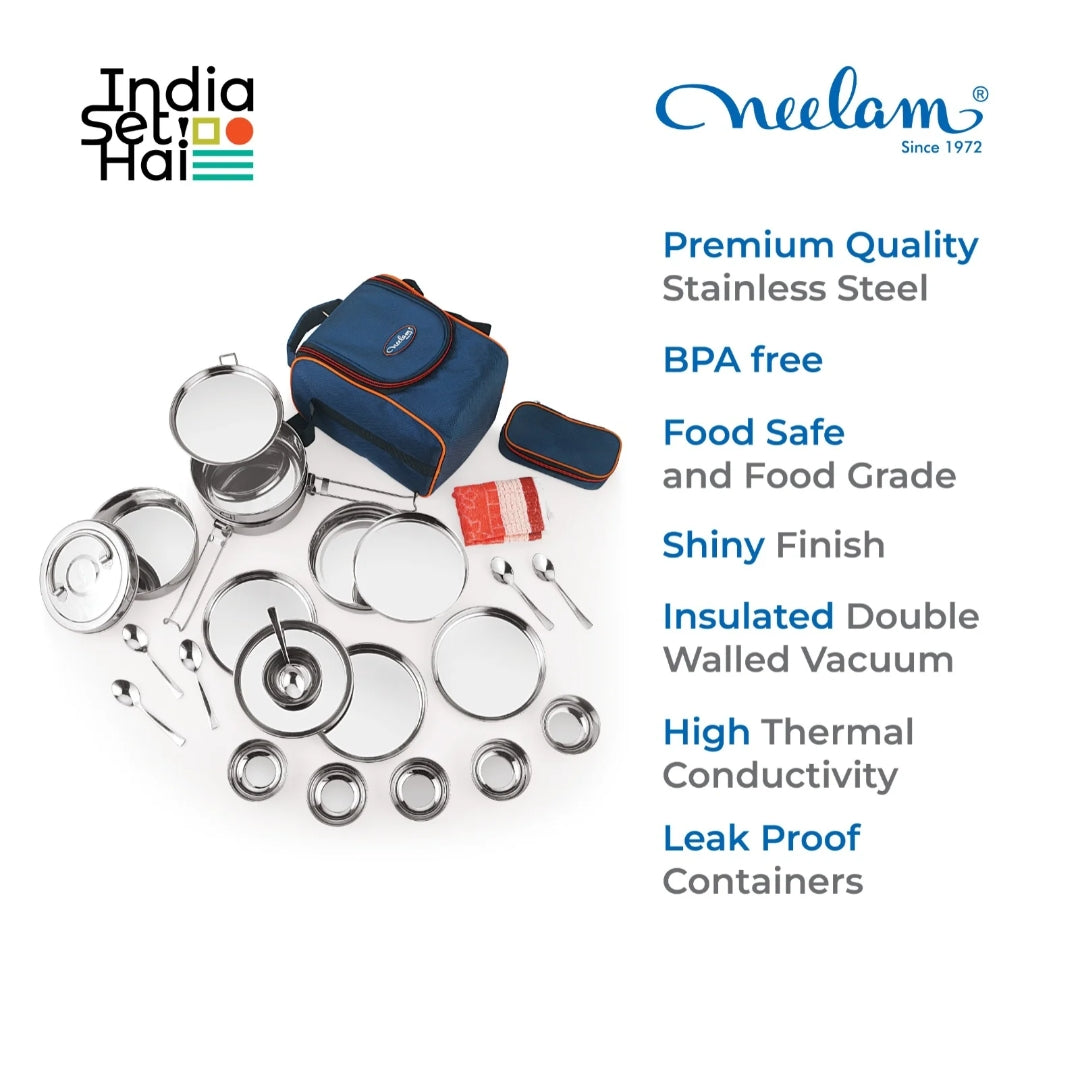 Neelam Stainless Steel Lunch Box/Tiffin with Bag, 26 Pieces Set, 5900 ml, Perfect for Picnic and Travel.