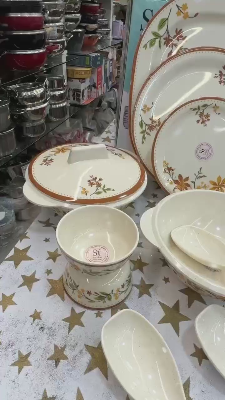 - Culinary Versatility - This 33pc Set includes 6 Dinner Plate: Size: (L 27.9 B 27.9 H 1.8), 6 Quarter Plate: (L 20.3 B 20.3 H 1.7), 6 Vegetable bowl (3.75'': L 9.5 B 9.5 H 5), 6 Vegetable bowl (4'': L 10.1 B 10.1 H 5.2), 2+2 Casserole with lid: (L 25 B 19 H 5), 1 Casserole without lid, 3 Serving Spoon: (L 25.5 B 7 H 5), 1 Serving Platter:( L 35.5 B 25 H 1.8)