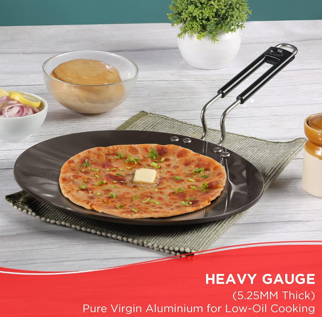 - HEAVY-DUTY HARD ANODISED CONSTRUCTION- Built with a 5.25 mm thick hard anodised surface, this tawa ensures durability, scratch resistance, and even heat distribution, making it perfect for everyday cooking needs.