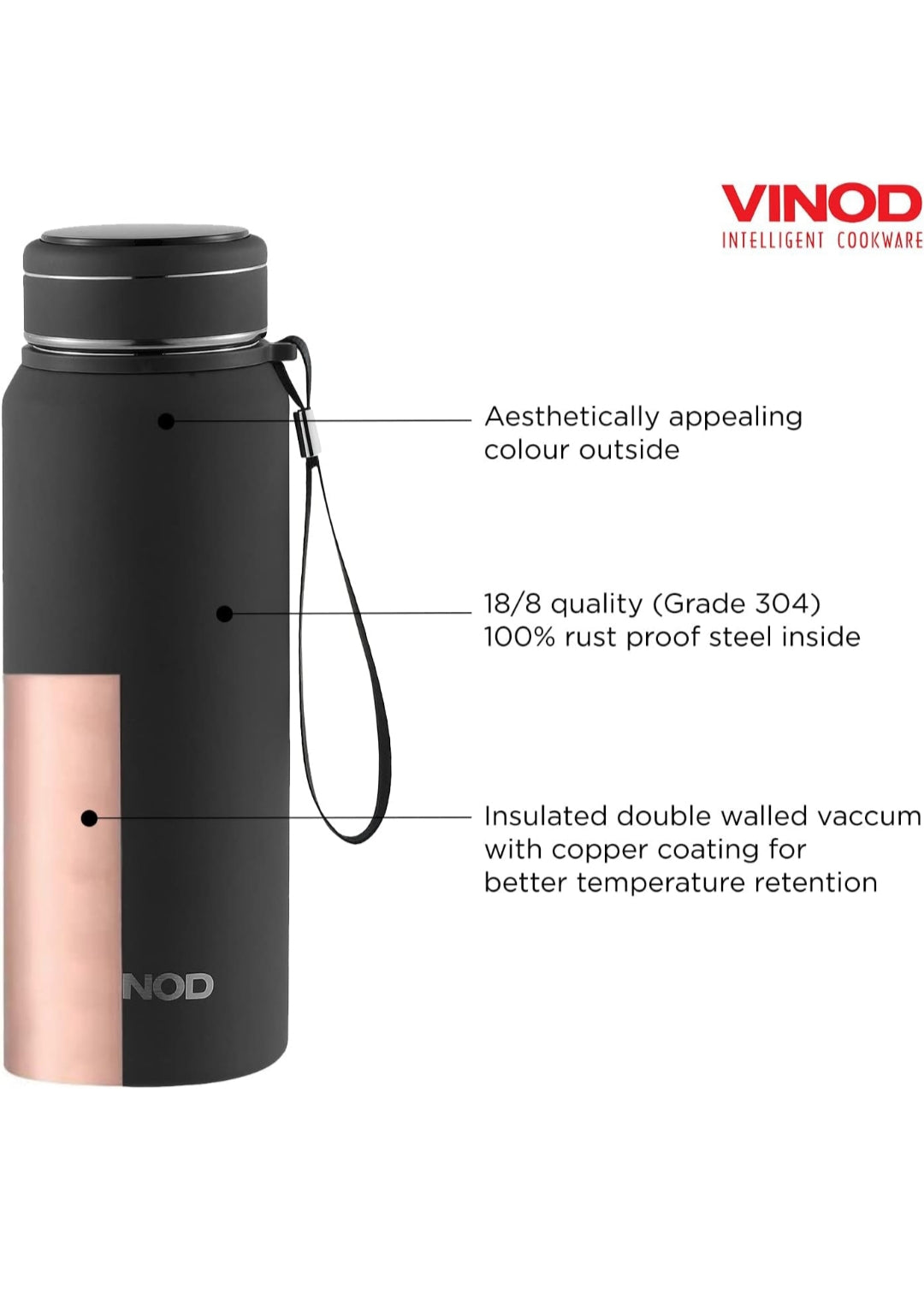 Vinod Bolt Vacuum Insulated Stainless Steel Water Bottle - 850ml | Copper Coating | Hot and Cold
