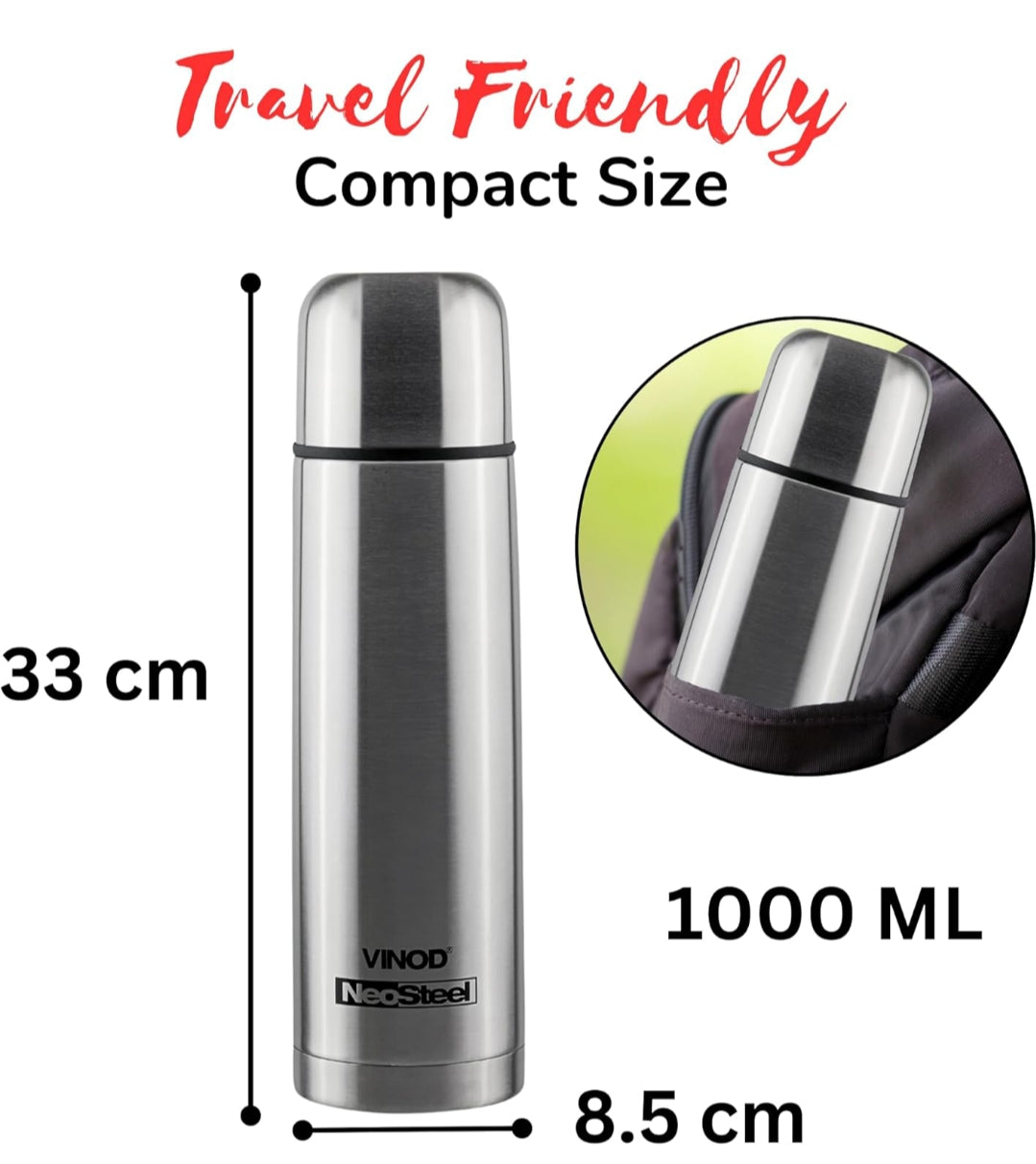 Vinod Bullet Stainless Steel Flask| Double Wall Insulated Steel Flask| Hot & Cold Water Bottle1000 ml